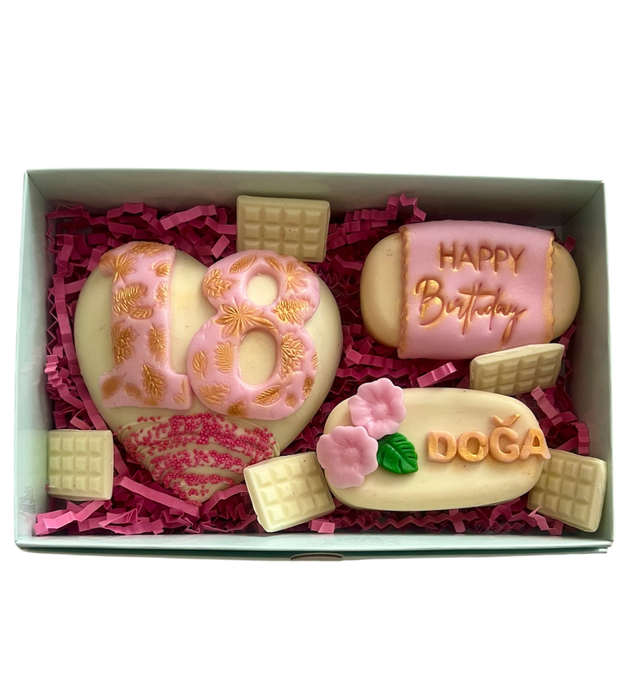 Heart Birthday Box pembe beyaz ürünümüzün içerisinde 2 adet büyük magnumcakepops bir adet kalp cakepops ve mini tabletler bulunur.