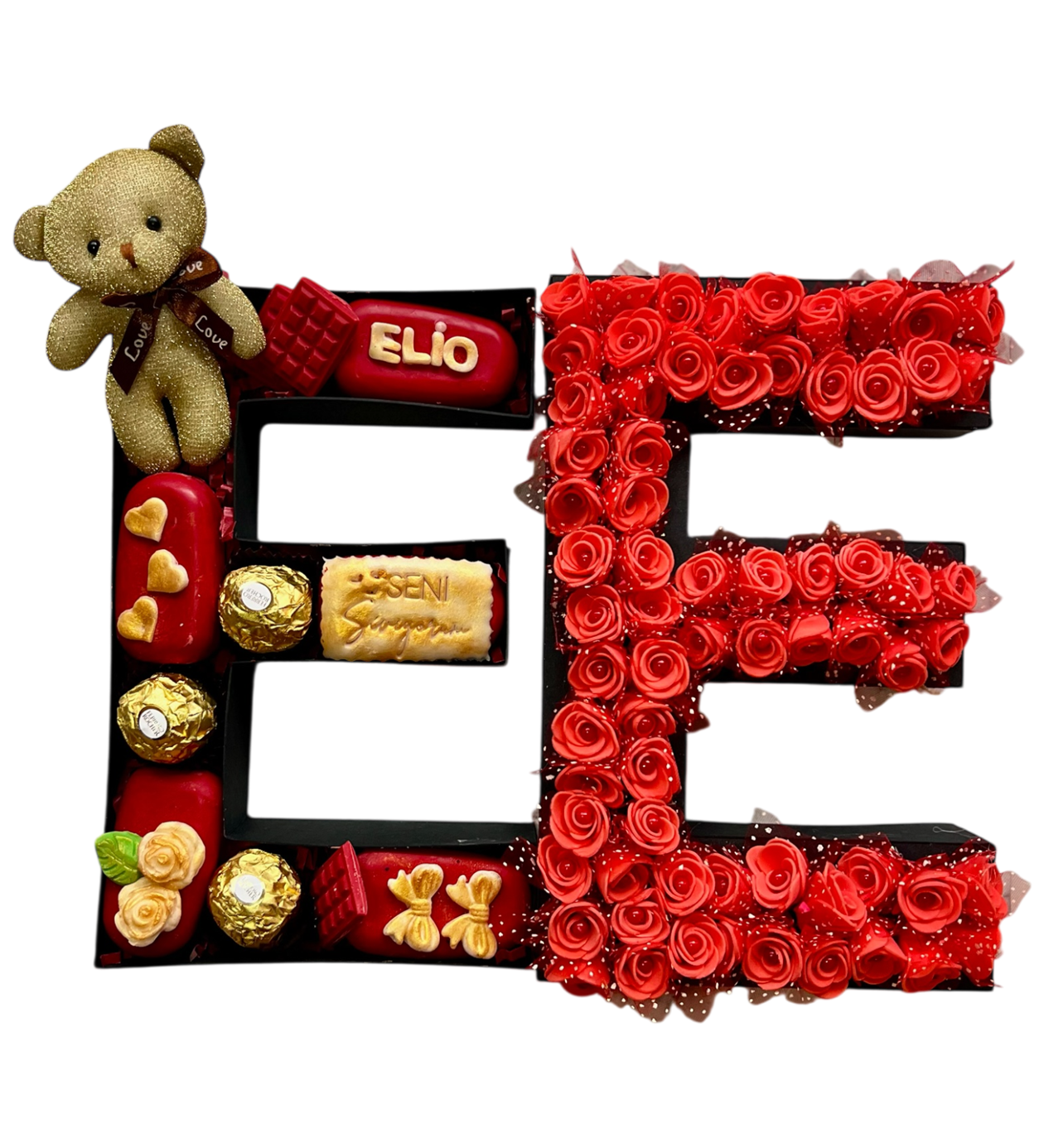 Bu özel tasarım harf kutu, hem çiçek şıklığında hem çikolata mutluluğunda bir hediye deneyimi sunar.