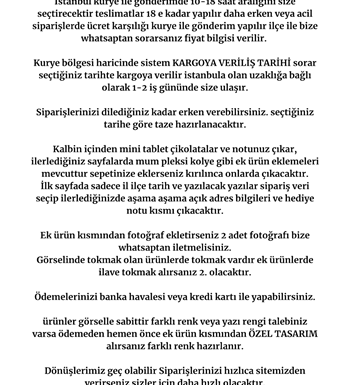 Kargo/kuryede yaşanacak aksaklıklardan tutanak tutulmadıkça sorumlu olmadığımızı belirtmek isteriz LÜTFEN gıda ürünlerinde değişim iade yoktur lütfen ürünü teslim alırken paketinde hasar görürseniz kurye kargo görevlisine tutanak tutturunuz.