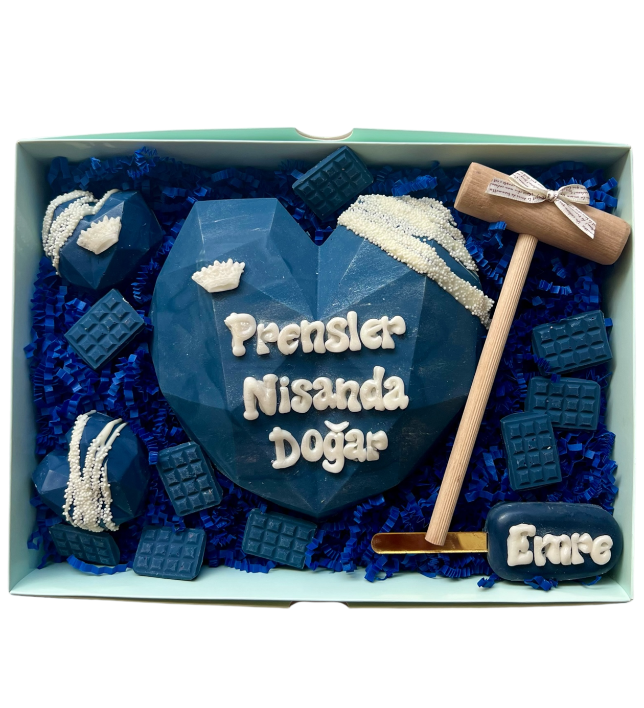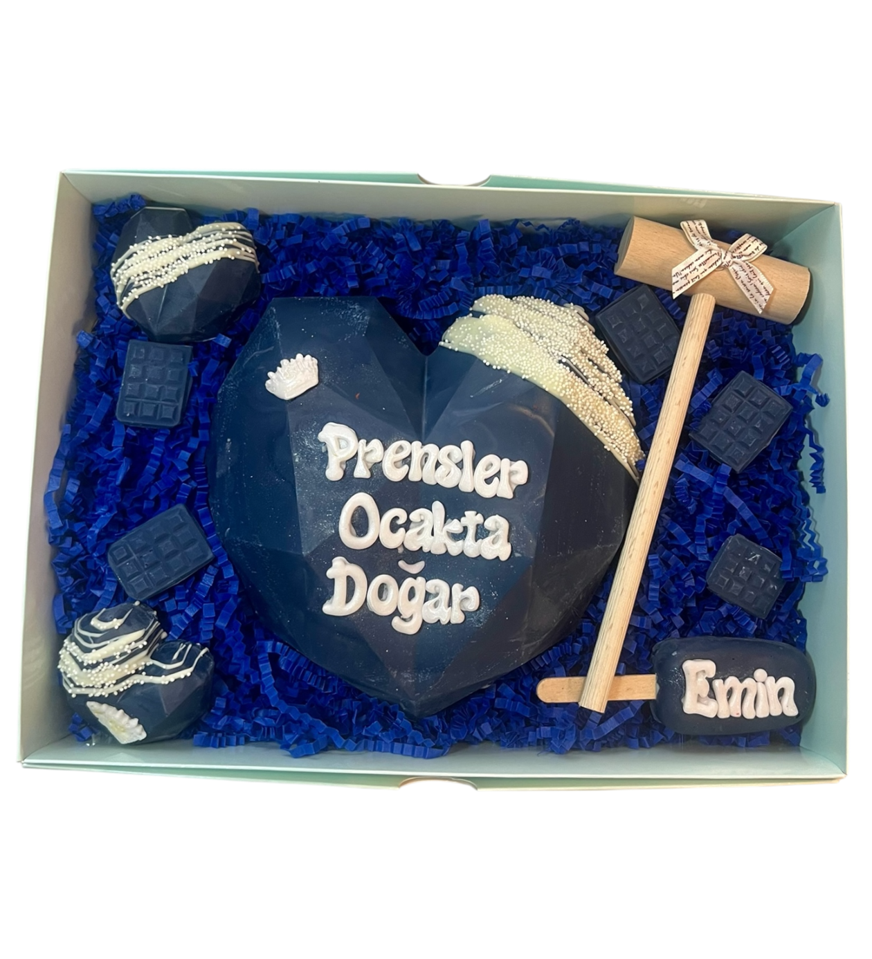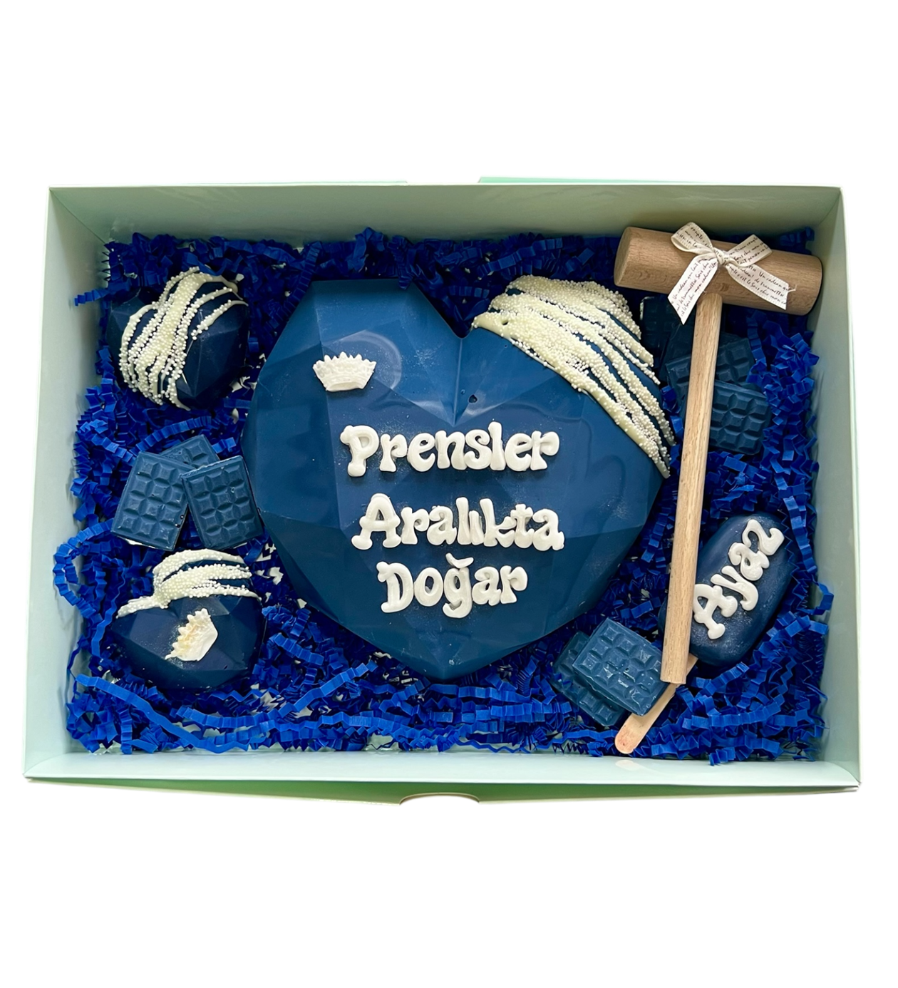 Pinyata Box lacivert ürünümüzün içerisinde bir adet büyük kırılan pinyata kalp 2 adet elmas kalp cakepops 1 adet magnumcakepops tokmak ve kalp kırılınca içinden çıkan mini tablet çikolatalar ve notunuzu içerir.