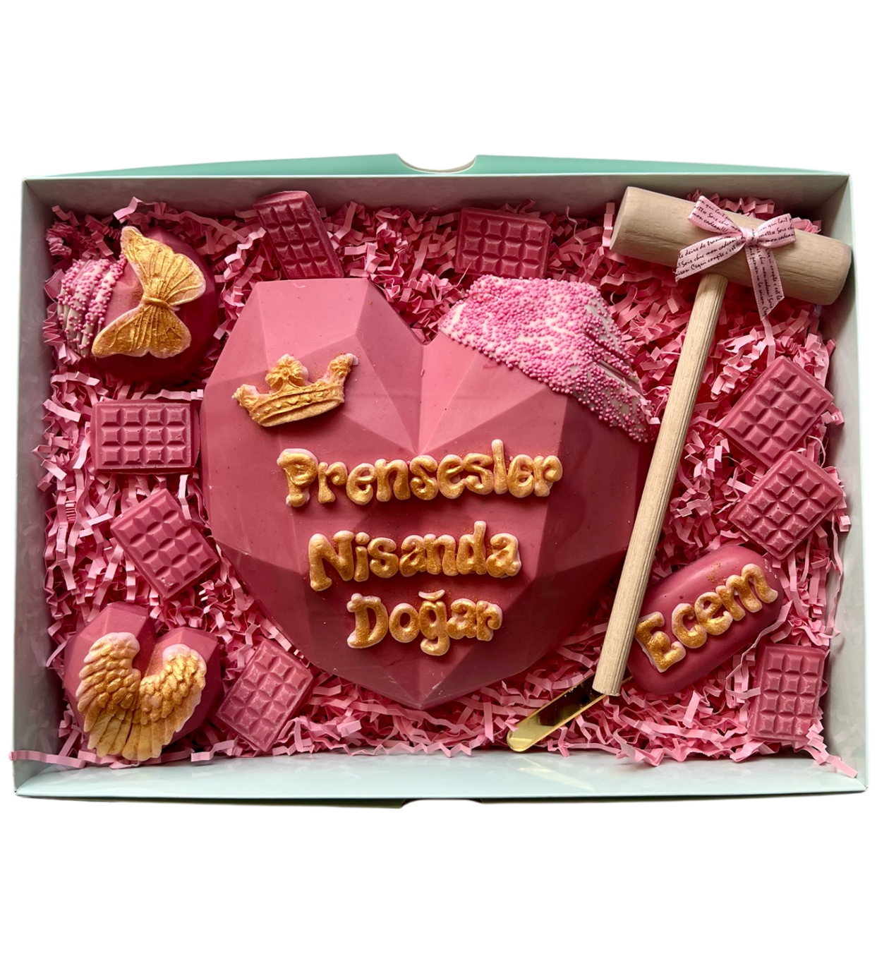 Pinyata Box pembe ürünümüzün içerisinde bir adet büyük kırılan pinyata kalp 2 adet elmas kalp cakepops 1 adet magnumcakepops tokmak, ve kalp kırılınca içinden çıkan mini tabletler ve notunuzu içerir.