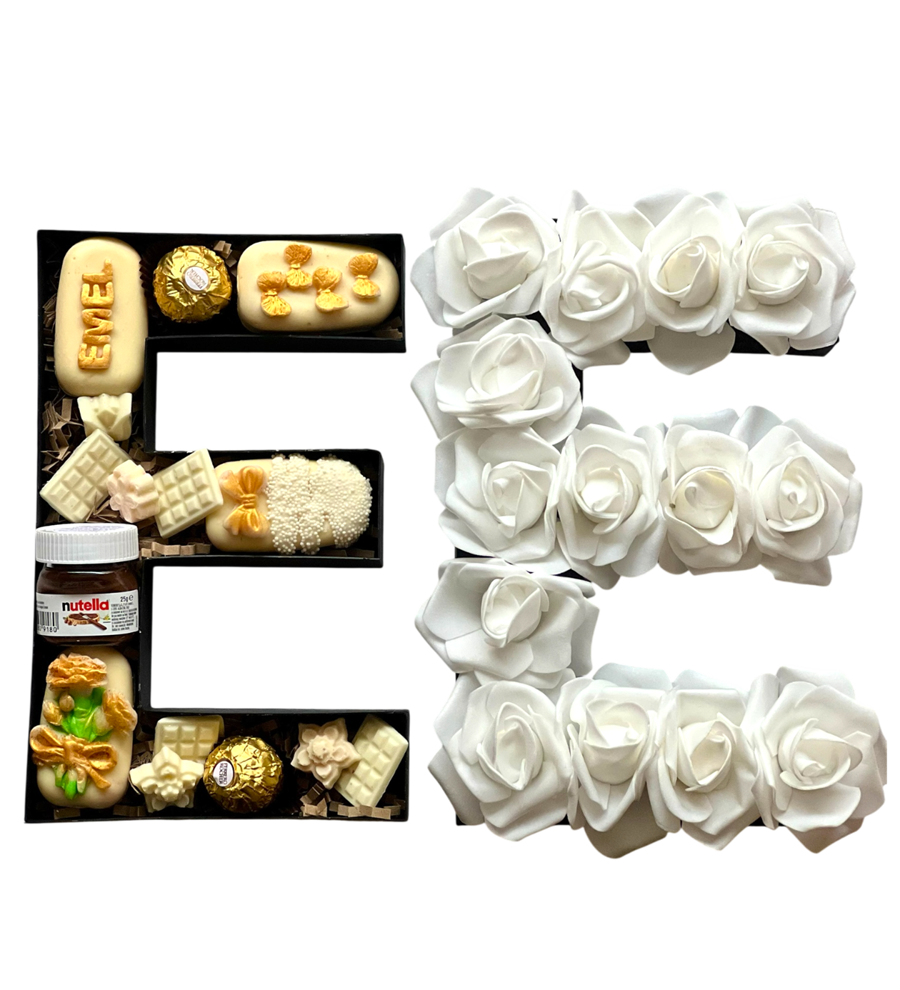 Kalıcı kaliteli yapay güller ile kaplı kapak leziz çikolata nutella ve ferrero rocher dolu leziz lux hediye deneyimi seçtiğiniz harfe özel hazırlanır.