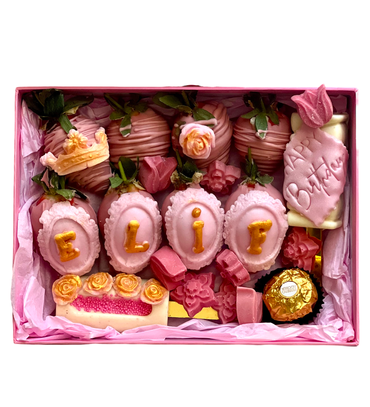 Leziz beyaz belçika çikolatasından hazırlanan kaplı çilekler ( yaklaşık 8 adet ) belirttiğiniz isim ile süslenir, 2 adet magnumcakepops içerir, ve el yapımı özel çikolatalarımızla doludur.